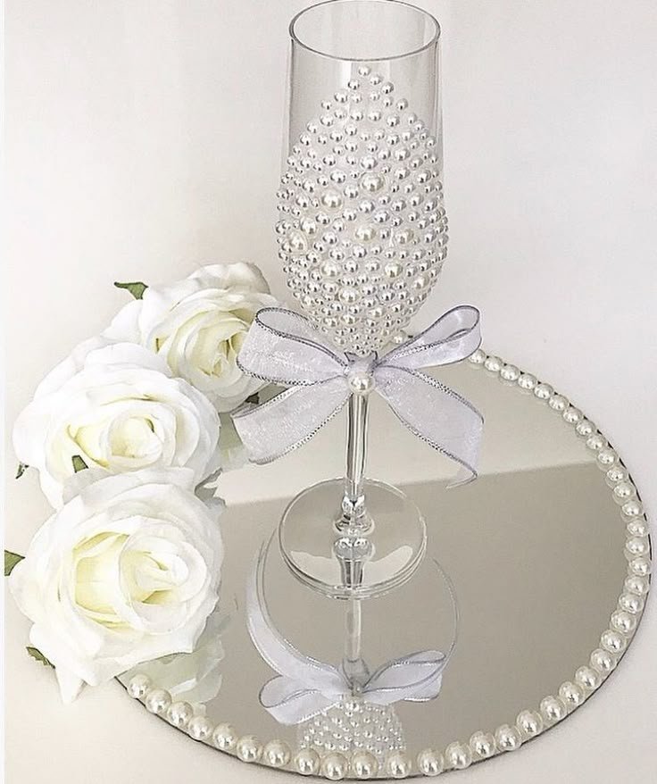 Add a touch of elegance to your wedding traditions with this stunning Doodh Pilai Glass Set. Featuring a crystal-adorned glass embellished with delicate pearls and a soft silver bow, it sits beautifully on a mirrored base trimmed with pearls and accented by white roses. Perfect for mehndi, baraat, or walima events — this graceful piece blends style and tradition, making it a must-have for your special day.