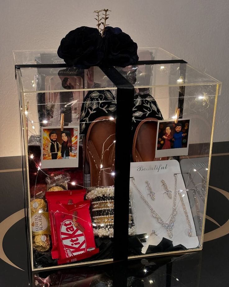 Make her smile with this Custom Luxury Gift Box, a stunning blend of elegance, style, and heartfelt thoughtfulness. Perfectly curated for special occasions, this transparent acrylic hamper glows with fairy lights and is tied beautifully with a velvet ribbon, making it an unforgettable gift experience.