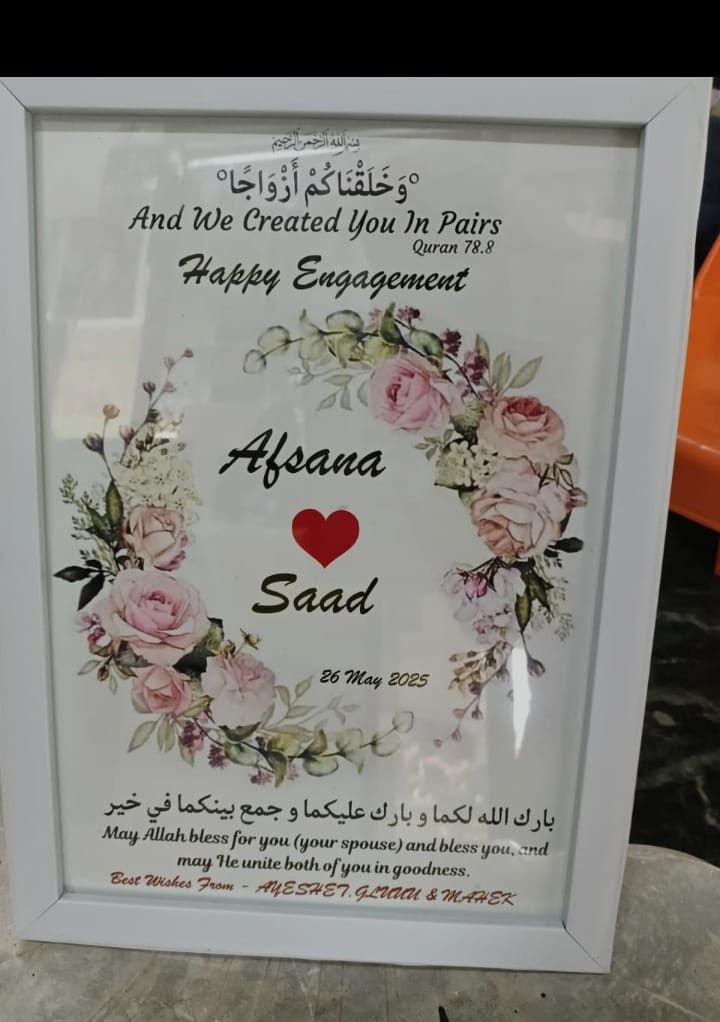 A beautifully designed Engagement Frame featuring elegant floral artwork, Quran verse “And We Created You in Pairs”, and a personalized layout with the couple’s names, date, and heartfelt Islamic dua. A perfect keepsake gift for engagements, nikkah events, and special celebrations.