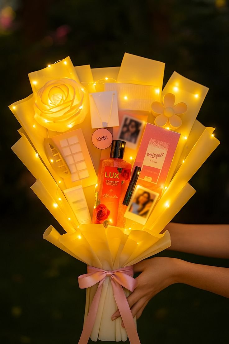 Pamper yourself or your loved ones with this beautifully arranged Luxury Self-Care Gift Bouquet. Wrapped in soft golden tones and glowing fairy lights, it includes premium beauty and skincare essentials for an elegant gifting experience. Perfect for birthdays, anniversaries, or just to show someone you care.