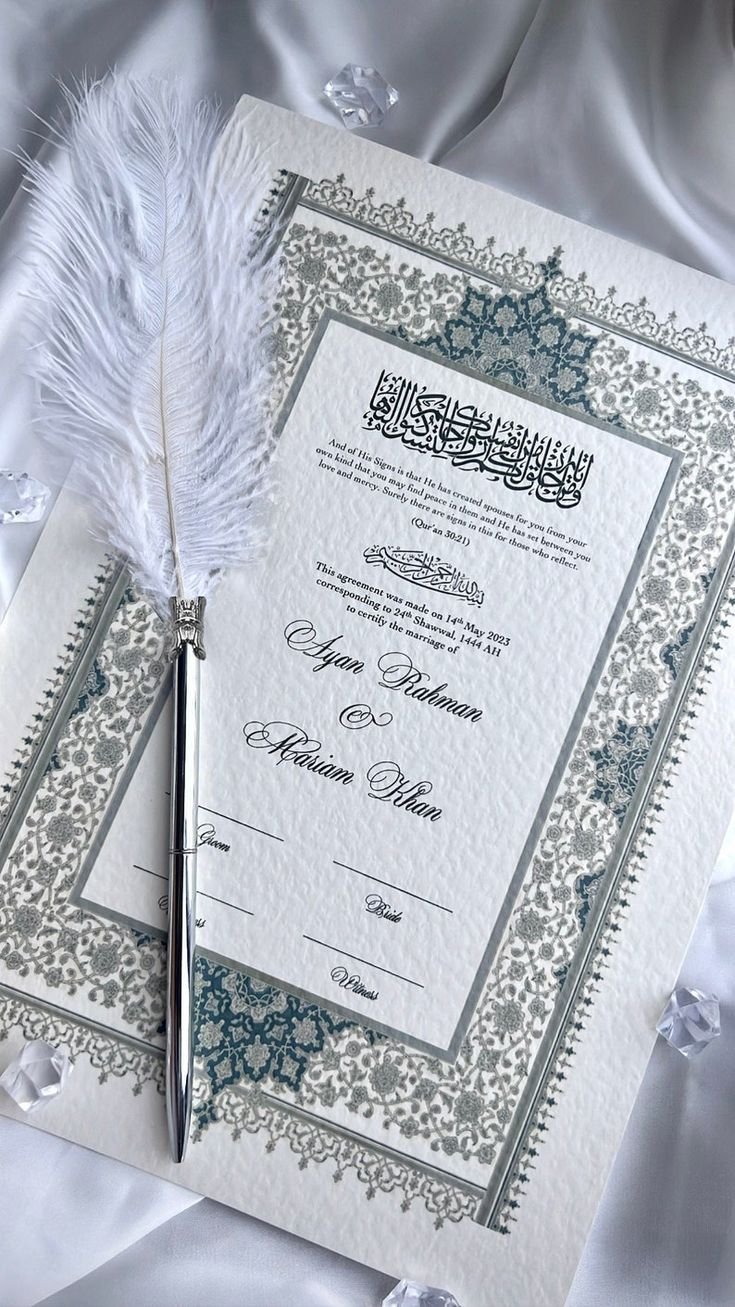 This premium piece is both a legal keepsake and a timeless memory, perfect for Nikkah ceremonies, wedding photography, and gifting.